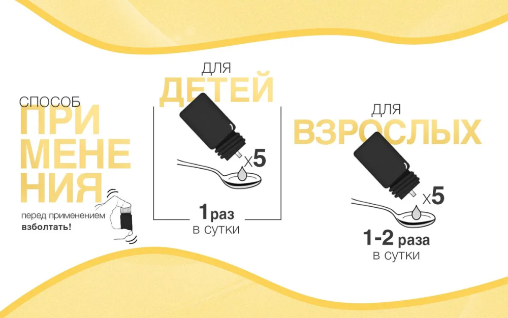 - Взрослым: по 5 капель 1-2 раза в сутки